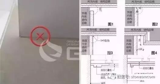 3、对于墙面不太高的石材,吊顶周边或设置迭级或凹槽(和原设计沟通),墙面石材直接置顶,同时墙面顶端石材正面以2×2mm的45°倒角(图4)。